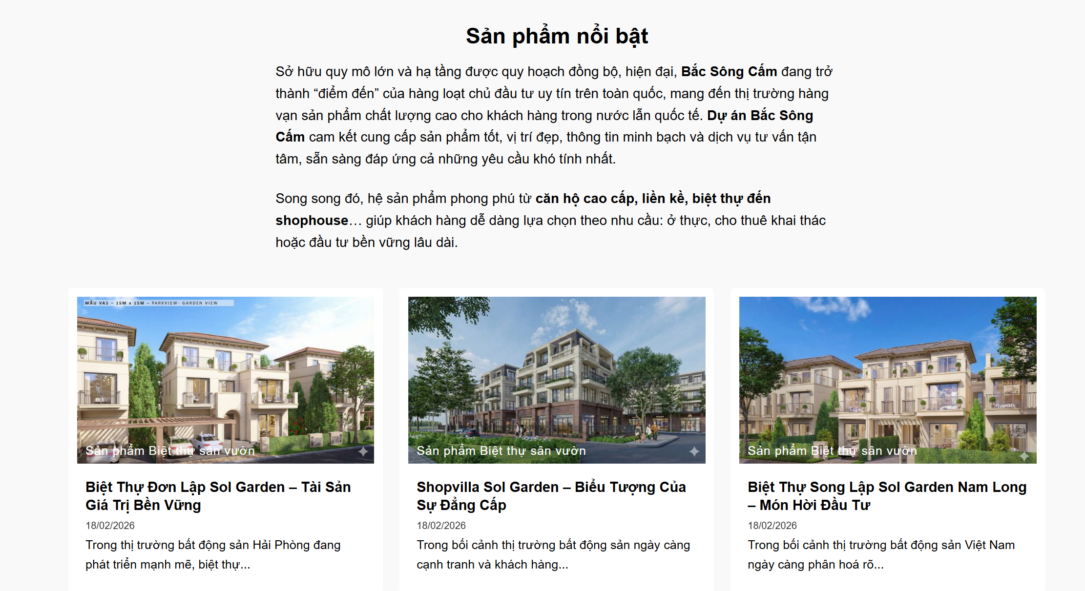Ở góc độ đầu tư, Bắc Sông Cấm trở nên đáng chú ý vì chuyên trang không chỉ giới thiệu dự án mà còn làm nổi bật từng nhóm sản phẩm. Hiện website đang đẩy mạnh các sản phẩm như biệt thự đơn lập Sol Garden, Shopvilla Sol Garden, biệt thự song lập Sol Garden, shophouse Sol Garden và nhà liền kề sân vườn Sol Garden. Việc tập trung vào những sản phẩm có khả năng vừa ở vừa tích sản hoặc tạo dòng tiền cho thấy thị trường Bắc Sông Cấm không chỉ mang màu sắc an cư, mà còn có sức hút ở khía cạnh khai thác thương mại và đầu tư tài sản.